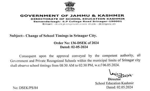 DSEK said, “Consequent upon the approval conveyed by the competent authority, all Government and Private Recognized Schools within the municipal limits of Srinagar city shall observe school timings from 08:30 AM to 02:30 PM with immediate effect from 06.05.2024.”