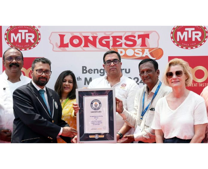BANGALORE, Mar 16: Celebrating it’s 100-year journey, MTR Foods announced that they are now the new GUINNESS WORLD RECORDS title holder for the Longest Dosa in partnership with Lorman Kitchen Equipments. MTR’s signature Red Rice batter was used to prepare this monumental dosa at its Bommasandra Factory. The record was created by a team of 75 chefs, comprising of both seasoned experts and budding culinary talent, under the guidance of MTR’s Cuisine Centre of Excellence. This record-breaking endeavour epitomizes the brand’s mastery of culinary craftsmanship and demonstrates its expertise in South Indian food. The dosa holds a cherished place in the hearts and palates of people across India, serving as the perfect centrepiece for this historic occasion. As Mr. Sunay Bhasin, CEO of MTR, said, “This is a moment of immense pride for us. We were attempting for a 100 feet dosa, however, we have outdone ourselves and have created a 123 feet dosa. This monumental dosa is a celebration of our heritage and the love we have been receiving for generations. Dosa has been a part of MTR’s legacy from the very beginning and it continues to be one of the most loved products of MTR even today. From being a humble South Indian dish, it is now recognized and loved worldwide. The longest dosa world record is a celebration of our bond with our consumers and their favourite dish.” Mr. Chandra Mouli, MD, Lorman Kitchen Equipment Pvt. Ltd. Added, “World’s Longest Dosa is being cooked on a specially built induction stove, the biggest ever from Lorman. Induction cooking equipment are highly efficient, sustainable, and eco-friendly, creating a safer ecosystem for chefs, we are proud to be partnering with MTR on this remarkable event.” This creation also serves as a symbol of community spirit, bringing together food enthusiasts. This culinary marvel was shared not only with MTR’s dedicated employees but also with children from local schools and members of the surrounding communities. With this, MTR broke the previous world record title of longest dosa of 16.68 m (54 ft. 8.69 in). About MTR