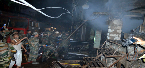 The intensity of the fire was so high that hundreds of people came out of their houses in panic and joined Firemen, Army and Policemen to control the fire. The fire started from one of the shops at around 12.45 am and it engulfed the adjoining shops and then entire three storey building.
