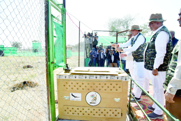 Each cheetah was kept in a separate special wooden box during the journey. After their arrival in Gwalior, the cheetahs were transported to the KNP in Sheopur, a distance of around 165 kms by road, in IAF helicopters. Wearing forest green sleeveless jackets and hats, Madhya Pradesh Chief Minister Shivraj Singh Chouhan and Union Minister for Environment and Forests Bhupender Yadav released these felines into the quarantine bomas after the animals arrived at the KNP around noon.