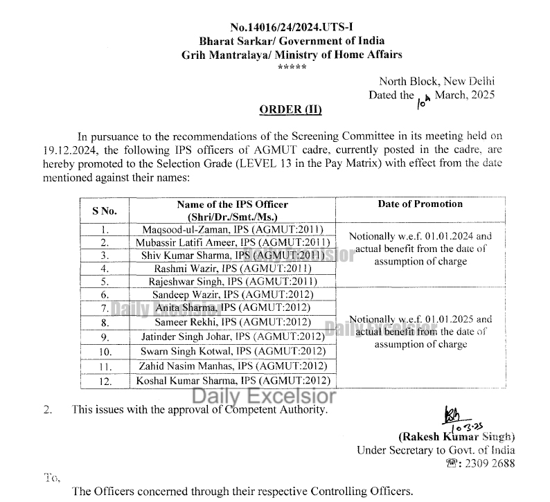 12 IPS Officers Of J&K Promoted To Selection Grade By Daily Excelsior - March 10, 2025 Share FacebookTwitterWhatsAppPinterestLinkedinCopy URLTelegramEmailTumblrReddItPrintKoo Jammu, Mar 10: The Ministry of Home Affairs, Government of India, has ordered the promotion of 12 IPS officers of AGMUT Cadre, currently posted in J&K, to Selection Grade (Level 13 of the pay matrix). Follow our WhatsApp channel