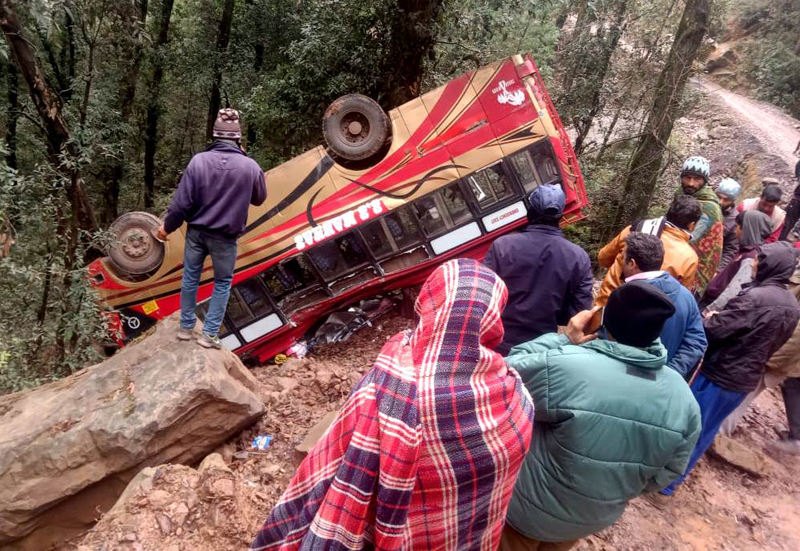 The bus, bearing registration number JK14G-4577, was on its way from Udhampur to Khorgali when it met with the accident around 10.35 AM. Bad condition of the road and big potholes apparently led the moving bus to go out of the driver’s control with the result it skidded off the road and turned turtle.
