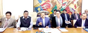 Union DoNER Minister Dr Jitendra Singh, flanked by Union Ministers Kiren Rijiju and Rajen Gohain, presiding over a meeting of senior officials and Nodal Officers to discuss the project of “Transformation of Aspirational Districts” in Northeast, at New Delhi on Thursday.
