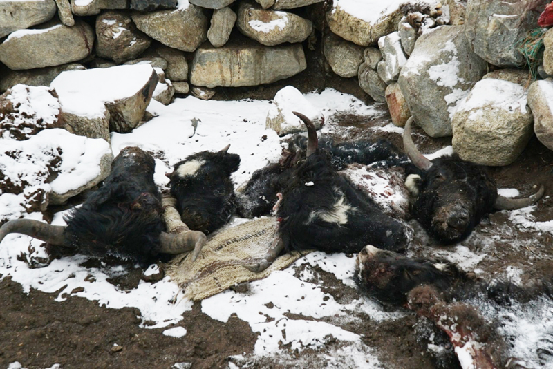 When the herders tried to search for the rest of the adult Yaks towards the valley, they found 6 adults also been killed in different locations of the pastures. The herders found that some of the adult Yaks are still alive and struggling to breath with severe injuries.