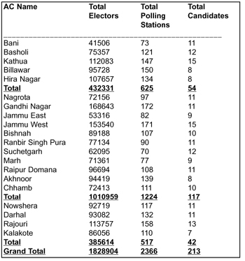 Jammu district accounted for 10.10 lakh electorates including 5.23 lakh male and 4.87 lakh females while Kathua district has 4.32 lakh voters, of which, 5,68,83 were male and 5,07,74 were females. District Rajouri has 3.85 lakh voters including 2.04 lakh male and 1.81 lakh females.
