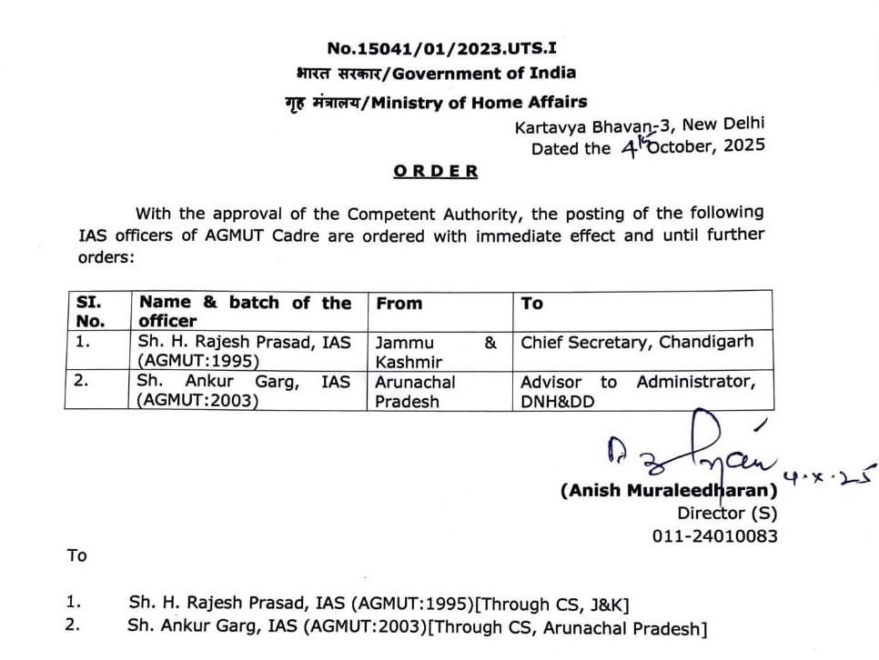 Prasad, a 1995-batch IAS officer of the AGMUT cadre, was serving in Jammu and Kashmir before this appointment. His posting to Chandigarh comes as part of a wider reshuffle notified by the MHA, which also shifted 2003-batch IAS officer Ankur Garg from Arunachal Pradesh to the post of Advisor to the Administrator of Dadra & Nagar Haveli and Daman & Diu.