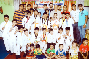 Medal winners of 1st District Hapkido Championship posing for a photograph along with dignitaries at Baby Caterers, Rehari in Jammu on Saturday.