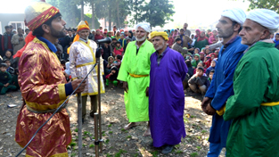 Artists presenting Bhand Pather in Baramulla on Saturday.