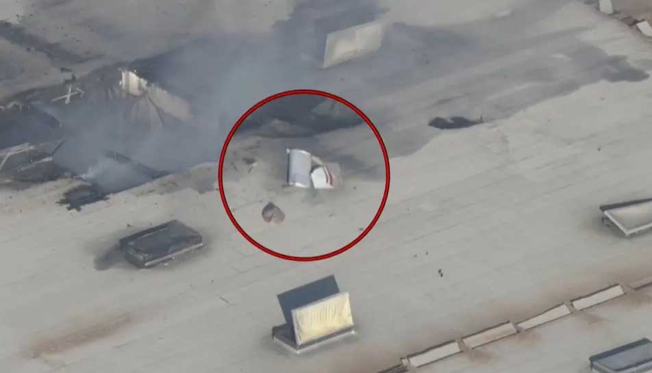 Security camera footage from Rucci Forged, a wheel manufacturer across the street, shows the plane was tilted on its side as it dove into the building, causing a fiery explosion and black plume of smoke.