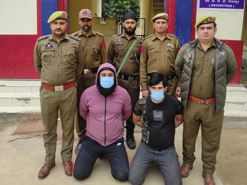Pritam Singh alias Sethi of Jerda, tehsil Ramgarh, district Samba and Narayan Sharma alias Shunna of Thalori, Vijaypur, Samba, were arrested with a 32 bore desi pistol, seven live rounds, a sharp edged weapon (toka) and 8.13 grams of heroin-like-substance from the house of one Anoop Singh alias Makhan of Ramgarh, a police official said.