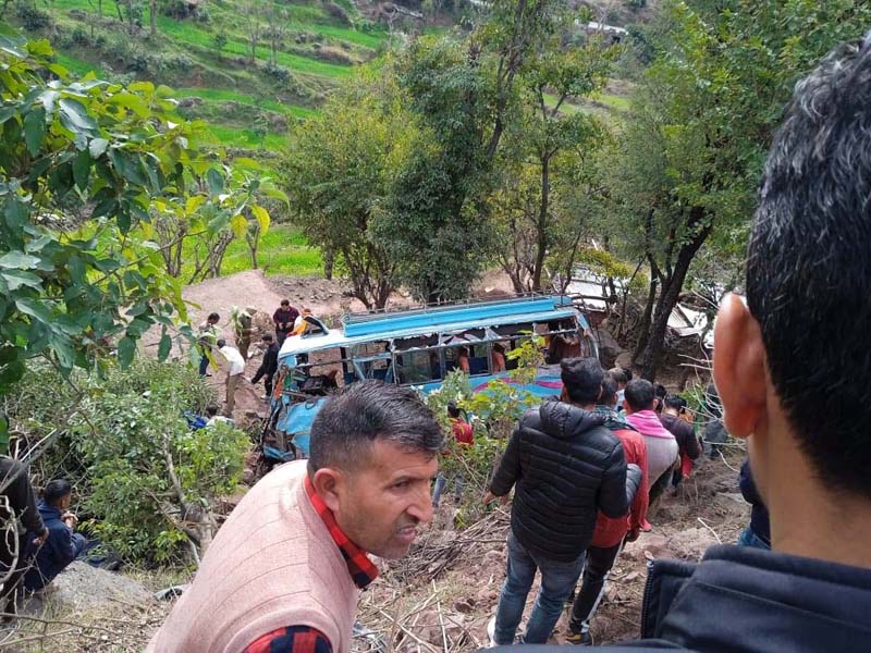 The accident took place around 12.30 pm when driver of the minibus (JK11A-0215) lost control on wheels while negotiating a curve with the result, the vehicle skidded off the road and rolled down over 50 feet into a gorge.