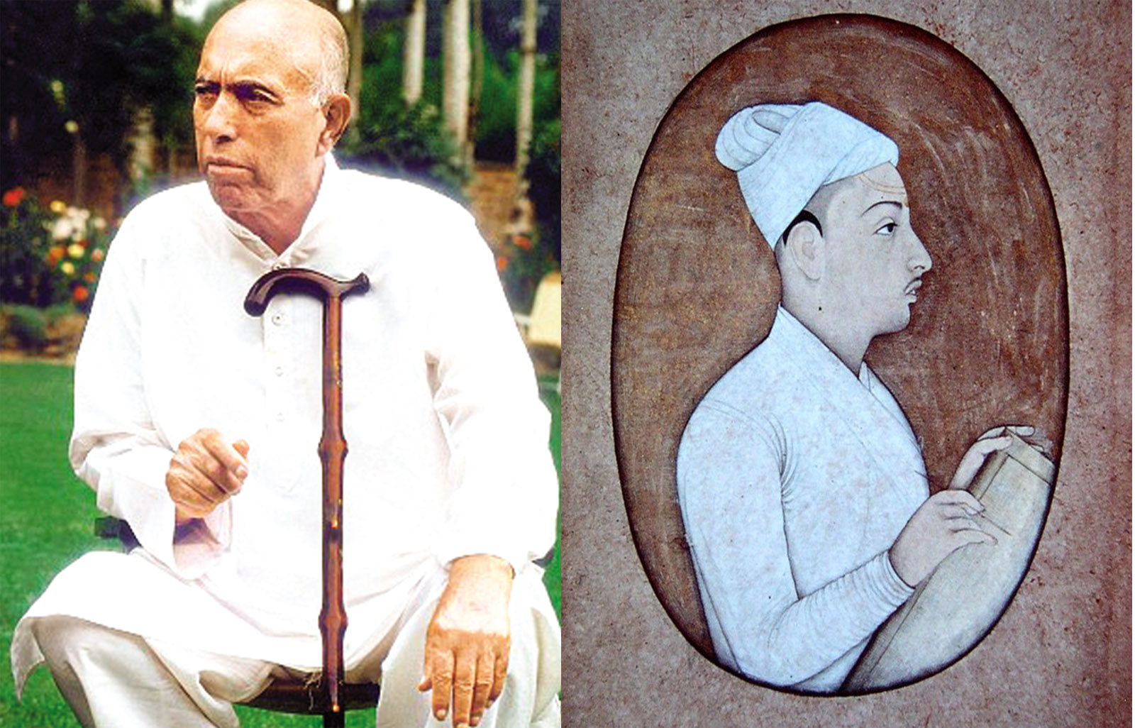 However, choice of Prof.Khilnani fell on Nainsukh, the doyen of Pahari Painting who is rated as one of the most original and brilliant Indian painters. Born at Gulehr in Himachal Pradesh, he blossomed into a painter of rare traits in our State. At the age of nineteen, he joined Jasrota principality as a court painter and afterwards came in contact with Balwant Singh who, according to famous Dogra historian S S Charak, was the youngest brother of Raja Ranjit Dev and had a jagir at Saruinsar . But it seems that Nainsukh would often shift between Jasrota and Saruinsar. After the death of Balwant Singh in 1863 Nainsukh shifted to Basohli principality and remained there till his death in 1780. In the words of Prof. B.N. Goswamy the famous art historian, Nainsukh is priceless gem of Indian Art. While eulogising Nainsukh,Goswamy says “One has to view it aesthetically, with patience for Nainsukh’s work does not grab you by throat. It grows on you and if you let him enter your consciousness, he will flow in you.” In order to appreciate his acumen over his subject, one has to have a glimpse of one of his masterpieces wherein it is seen how vividly Nainsukh has captured his patron Balwant with musicians playing a Raga for Balwant Singh during the rainy season. The prince wearing a pink ‘achakan’ secured by a maroon and gold ‘patka’ and pearl jewellery, holding a ‘huqqa’ pipe and gesturing to woman facing him dressed in orange and holding ‘tanpura’ both shielded by umbrellas carried by attendants and accompanied by a group of men dressed in white’ jama’, to the left musicians wearing various instruments and to the right his attendants, including the artist at lower left.