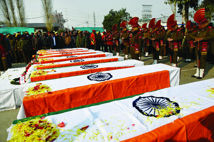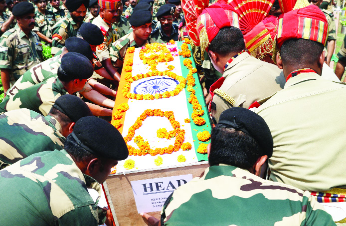 Force (BSF) officers carry the coffin of Mohammed Imteyaz who attained martyrdom in Pakistan shelling.