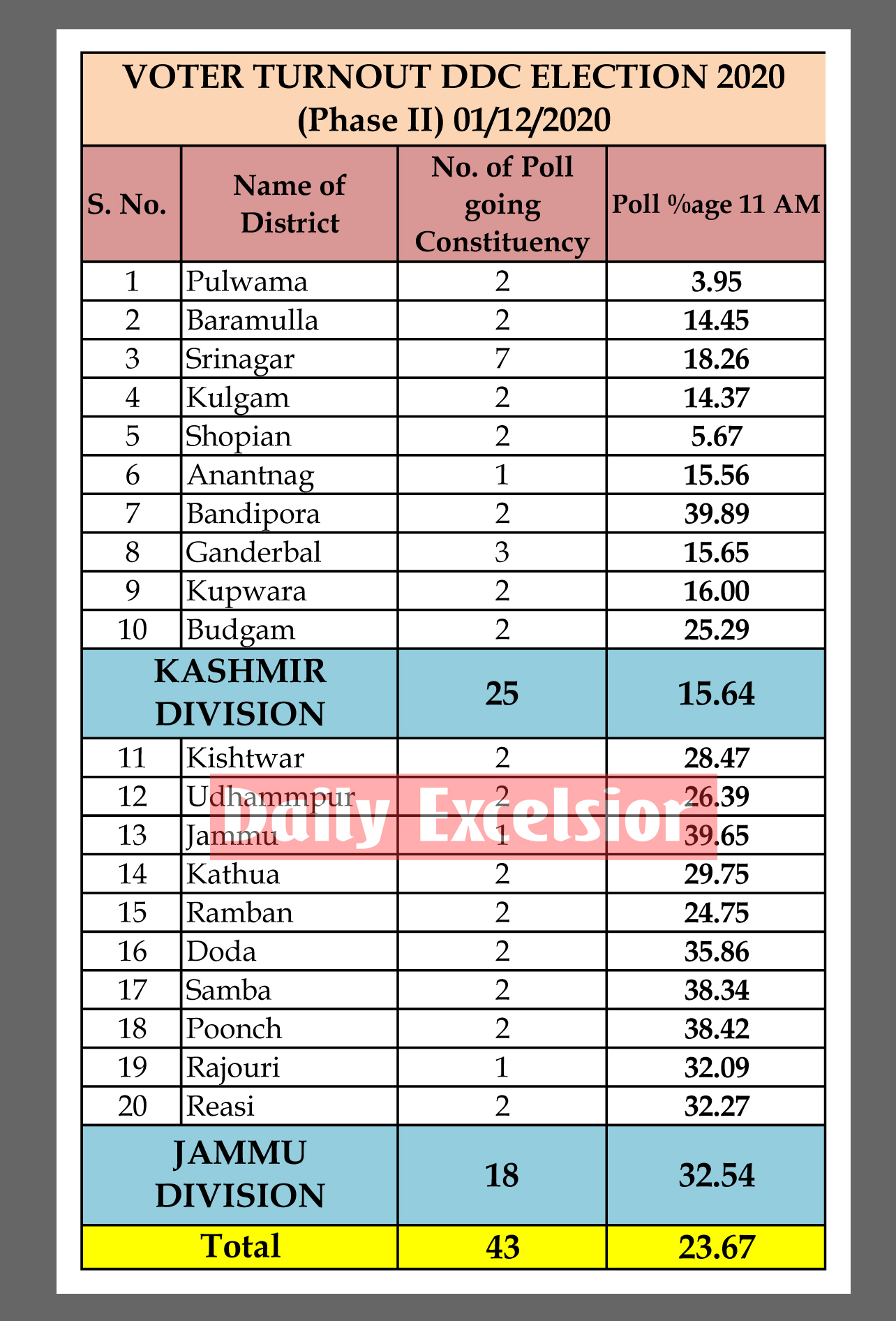 JAMMU: The 2nd phase of DDC elections 2020 recorded voter percentage of 23.67 % across different constituencies spread over all the districts of Jammu and Kashmir till 11:00 am.