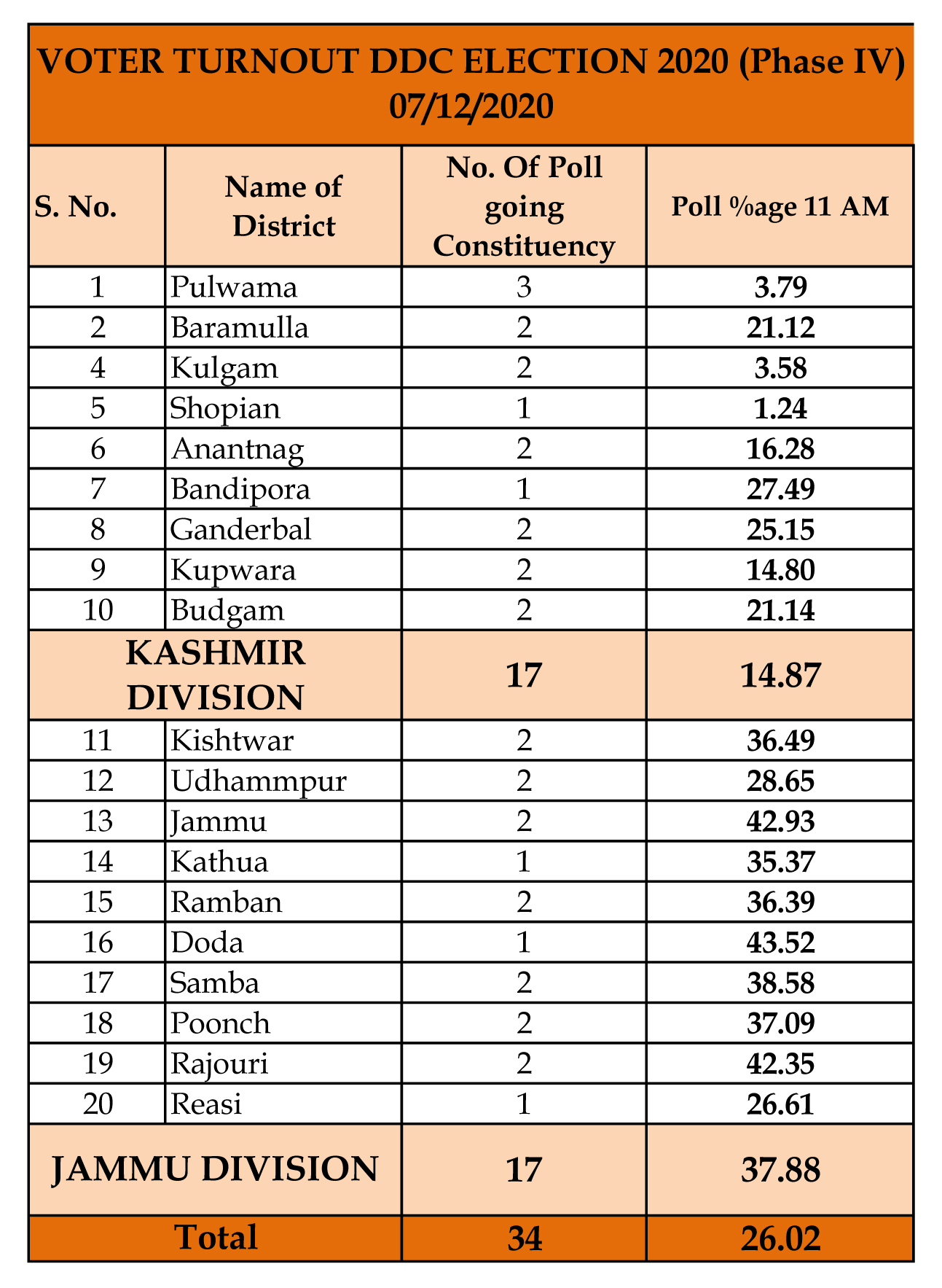 JAMMU: The 4th phase of DDC elections 2020 recorded voter percentage of 26.02 % across different constituencies spread over different districts of Jammu and Kashmir till 11:00 am today.