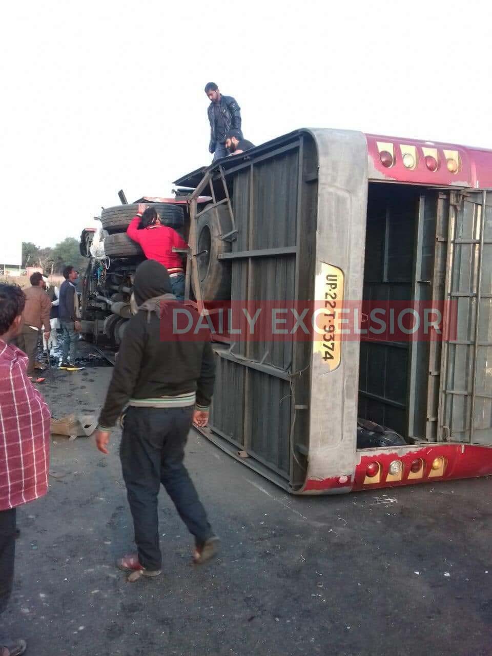 The bus, coming from Punjab, turned turtle after it collided with a truck which it was trying to overtake at Jatwal village in Samba district, they said.
