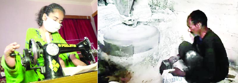 29 years old Madhubala sewing masks with her feet (L) and 81 years old Shanker Singh grinding grains of his villagers free of cost.
