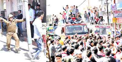 The trouble erupted this morning around 10.30 am when hundreds of students assembled near the Rehari Chungi Chowk and blocked the ever busy road by holding a strong protest demonstration there. Amidst raising of slogans against JK BOSE and MoS Education, they were demanding grace marks for the wrong done in distribution of marks in the Class 12th question paper of Physics, which was held on March 1.