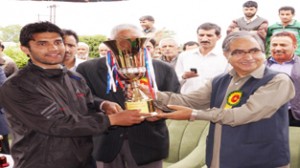 Minister for Agriculture Gh Hassan Mir presenting trophy to winners in Tangmarg on Saturday.