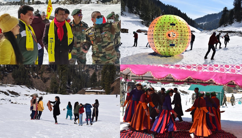 The main attractions of the day were cultural programmes, traditional sword and stick dance performed by tribal community, zorbing ball, skiing, sledging, snow roping, baloon shooting, folk dance, Kud dance, Ladakhi dance, besides stalls of food items were also put up for the convenience of the visitors.