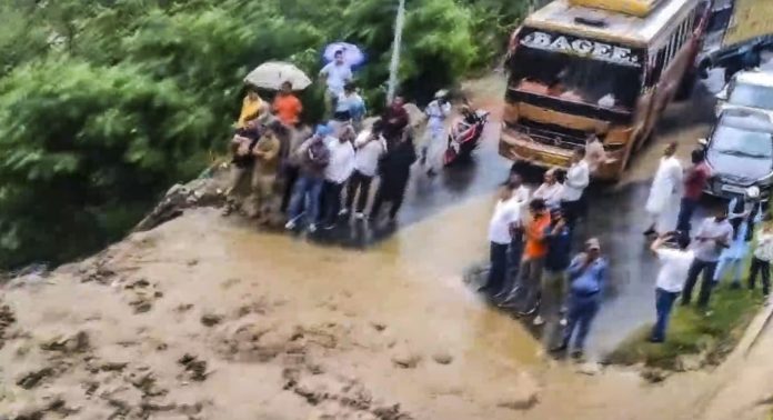 People stranded following flash floods, at Doda Bhaderwah road near Pranoo, J&K
