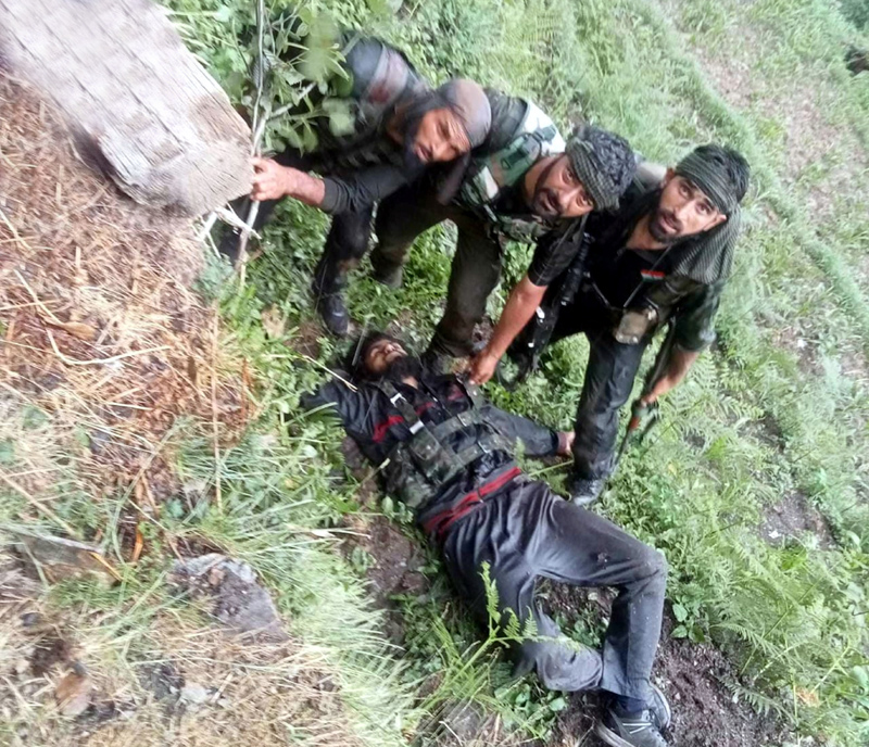 Army personnel pose with slain terrorist in Gandoh on Wednesday. -Excelsior/Tilak Raj