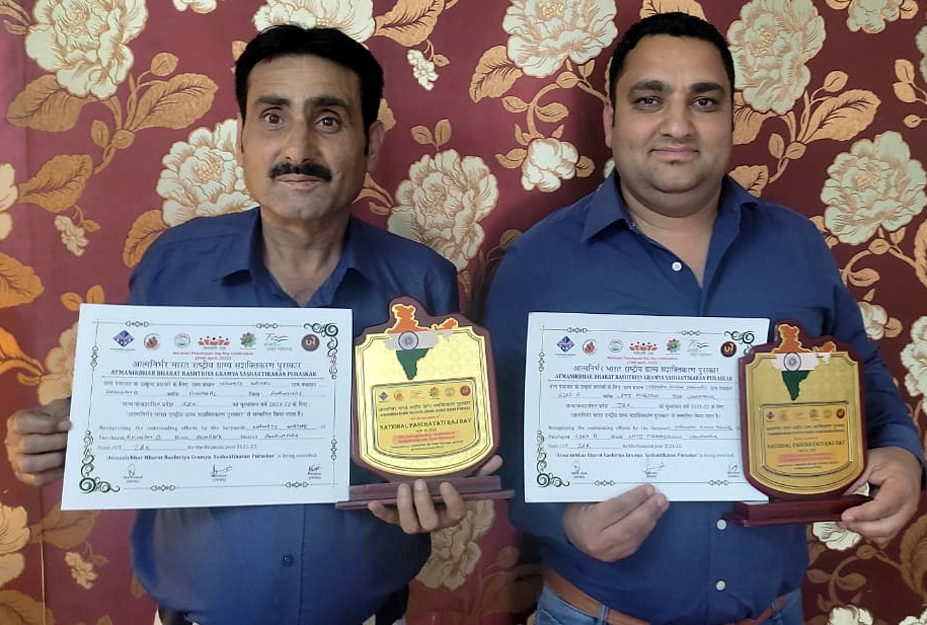 Nana Jee Wattal from Kashmir, Sarpanch Akingam B; Makhan Singh Manhas, Sarpanch Sira, Latti, Sudh Mahadev and Pinki Devi, Sarpanch Sorelain, Parnoti Block Kathua were honoured with Atmanirbhar Bharat Rashtriya Gramya Sashaktikaran Puraskar 2022 at an impressive function held at Dehradun, Uttrakhand.