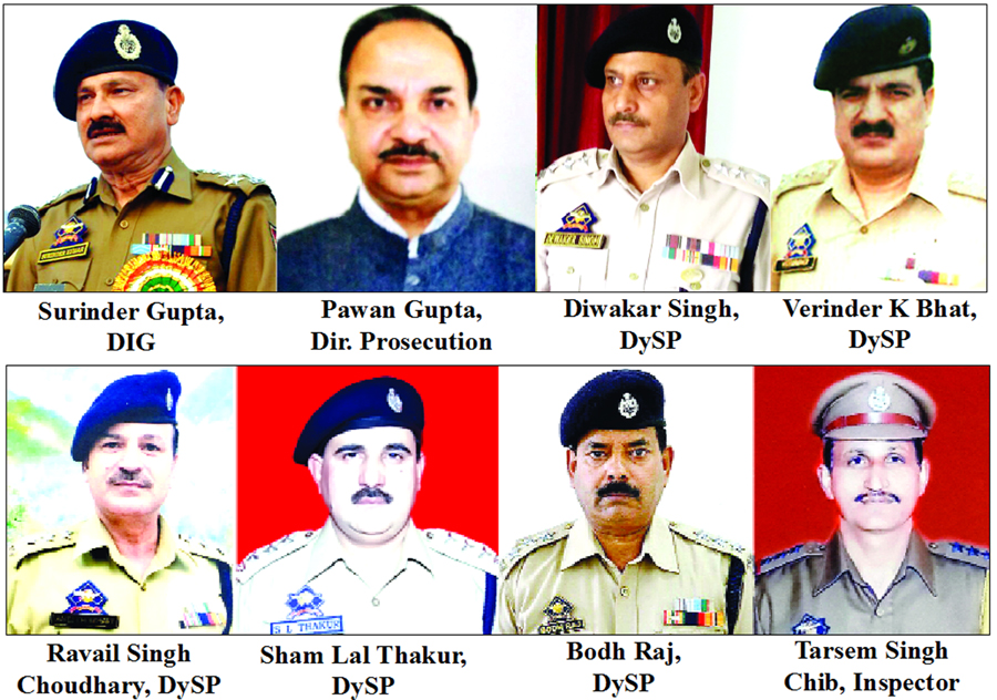 They are Garib Dass, former DIG Baramulla, Ajaz Ahmed Bhat, SSP Kupwara, Shabir Nawab, ASP Kulgam, Azhar Bashir Baba, ASP Pulwama, Shahzada Kabir Mattoo, DySP (PC) Pampore, Mohammad Shafiq Najar DySP (Hqrs) Pulwama, Syed Majeed Mosavi, DySP (PC) Srinagar, Hilal Khaliq Bhat, DySP (PC) Lolab, Prithpal Singh DySP (PC) Kathua, Diwakar Singh DySP SDPO Border Chadwal Kathua, Satish Kumar DySP (Prob) Pulwama, Fayaz Ahmad Sheikh HC, Nisar Hussain, SGCT, Javaid Ahmed Sheikh CT, Fayaz Ahmad Khan HC, Raouf Ashraf Yatoo CT, Hans Raj SGCT, Shabir Ahmed SGCT, Bashir Ahmad Gullar Gursi CT, Habibullah Sheergojree SGCT, Omer Hussain Wada CT, Zubair Ahmad Sofi CT, Saleem Yousuf Khan SGCT, Javid Ahmad Lone SI, Waseem Gull SI, Tsewang Narboo SI, Fayaz Ahmad Bhat HC, Mukhtar Ahmad CT, Mohammad Shafi Bhat CT, Arshid Ahmad Ahangar CT, Mohammad Irfan Jura CT, Abdul Rashid Reshi HC, Dheeraj Babu Jungral SGCT, Basharat Hussain CT, Irshad Ahmad Dar CT, Javid Ahmad Lone CT and Shakeel Ahmad Sheikh CT.