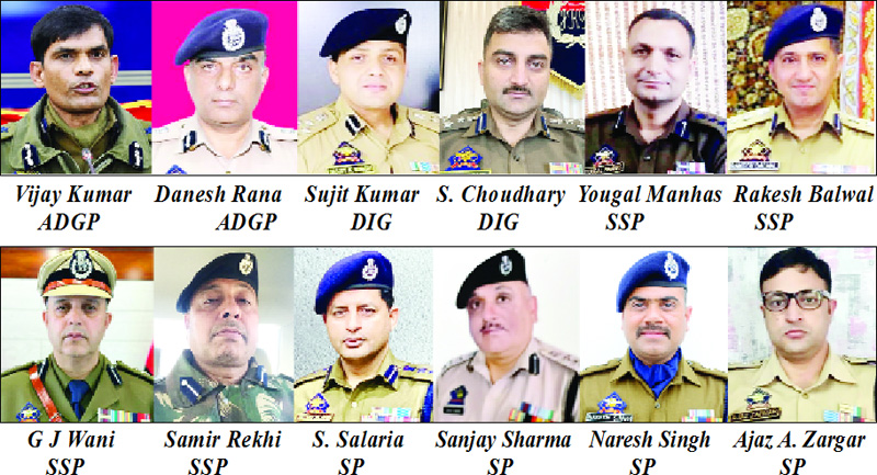 Among the 168 police personnel who have been awarded with the Jammu and Kashmir Police Medal for Gallantry are six SSPs and 3 SPs. They are Dr Vinod Kumar, SSP Udhampur; Rakesh Balwal, SSP Srinagar (awarded with JKPMG and 1st Bar JKPMG); GV Sundeep Chakravarthy, SSP, AIG (CIV), Police Headquarters; Yougal Kumar, SSP Kupwara; Shabir Nawab, SSP Sopore; Ghulam Jeelani Wani, SSP Pulwama; SPs-Iftkhar Talib (awarded with 2nd and 3rd BAR JKPMG), Tanushree, and Naresh Singh-Additional SsP, Mohammad Majid Malik, Pardeep Singh (awarded with JKPMG, 1st BAR JKPMG and 2nd BAR JKPMG), Tanweer Ahmad Dar, and Feroz Ahmad; DySsP, Surinder Singh, Mohan Lal (awarded with 1st and 2nd BAR JKPMG), Mohammad Usman (awarded with 1st BAR JKPMG, 2nd BAR JKPMG), Mohammad Aslam Wani, Isha Gupta, Sumit Kumar Sharma, Khalid Ashraf, Syed Peerzada Mujahid-ul-Haq, Sarfaraz Bashir Ganai (awarded with 1st BAR JKPMG and JKPMG), Rohit Kumar, Salim Jahangir Lone, Himayun Muzzammil, Faizan Ali, Anzar Shah, Vaseem Mehmood, Zafar Mahdi, Gazenfer Syed, Rashid Younis, and Ajaz Ahmed.