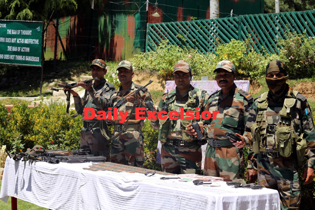 Army display Arms and Ammunition recovered from five LeT militants at Drugmulla in Kupwara district on Sunday….Excelsior\Aabid Nabi