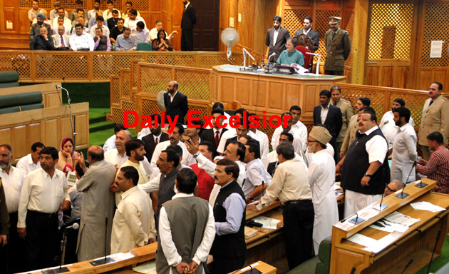 Jammu and Kashmir Legislative Assembly (LA) today witnessed ruckus after the entire opposition raised slogans and stormed into the Well of the House demanding revocation of SRP-105 which allows the government to lease out mining to the contractors, including from outsiders. …Excelsior\Photo