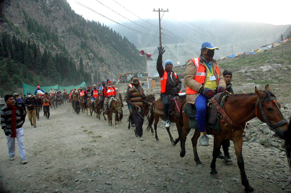 Pilgrims on ponies crossing a rough terrain at Domail on Friday, on way to Holy cave shrine of Amarnath to worship the self made Ice Shivlianga.