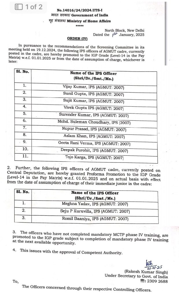 JAMMU, Jan 2: Four IPS Officers of erstwhile J&K Cadre, currently posted in AGMUT Cadre, Sunil Gupta, Sujeet Kumar, Vivek Kumar, and Mohammad Suleman Choudhary, have been promoted to the IGP grade while as two other IPS officers, Vinod Kumar and Shri Ram Ambarkar Sinkar, have been promoted to the DIGP Cadre.