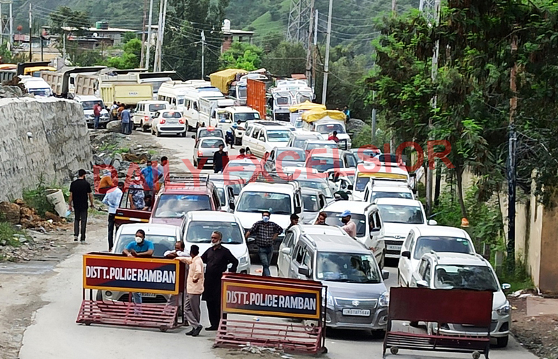 Vehicles stranded at Ramban after highway was blocked at Dalwas. —Excelsior/Parvaiz Mir
