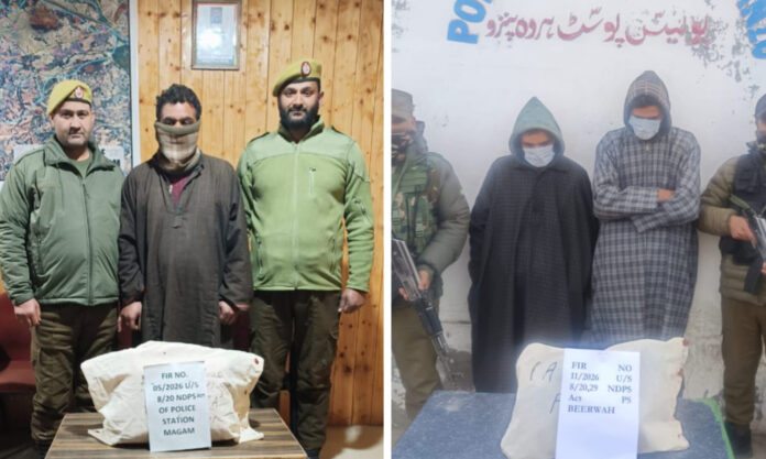 A police statement said, “Budgam Police today arrested three drug peddlers in two separate operations conducted in Magam and Hardpanzoo areas of the district, leading to the recovery of a substantial quantity of contraband substances.”