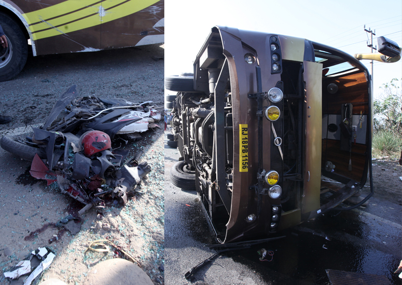 The video coach bus bearing registration number RJ18PB-1156 turned turtle and fell on scooty bearing registration number JK11B-2963.