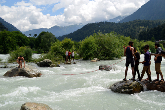 People searching for the bodies of four youth who were drowned in river Lidder near Nunwan, Pahalgam. (Another pic on page 6) -Excelsior/ Sajad Sameer