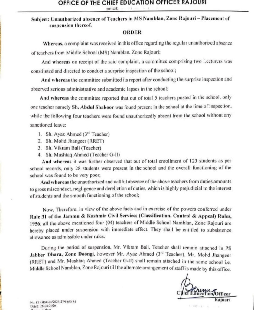 JAMMU, Apr 29: The Chief Education Officer Rajouri has placed 4 teachers of Middle School Namblan in Zone Rajouri under suspension with immediate effect after a surprise inspection found them absent from duty without sanctioned leave.