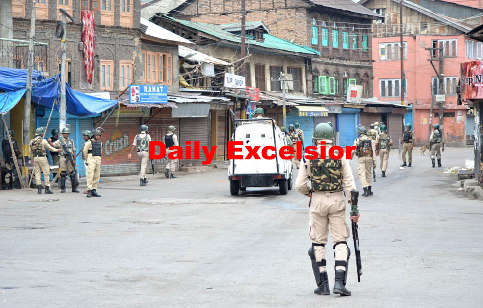 Paramilitary CRPF personnel patrolling deserted Nowhatta area of Old City during strict curfew.Excelsior\Shakeel-ul-Rehman By Daily Excelsior - July 15, 2016 Share FacebookTwitterWhatsAppPinterestLinkedinCopy URLTelegramEmailTumblrReddItPrintKoo Security forces' vehicles patrol Nowhatta area of Old City during strict curfew ExcelsiorShakeel-ul-rehman. Follow our WhatsApp channel