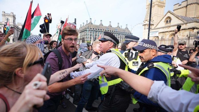 “Throughout the demonstration, there was a coordinated effort to prevent officers from carrying out their duties which escalated to violence where officers were punched, kicked, spat on and had objects thrown at them,” the Met Police said.