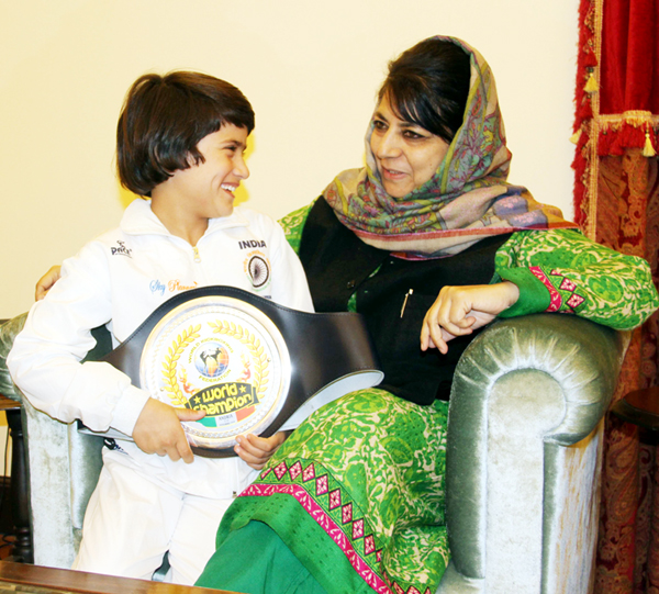 JAMMU : Eight-year old Kashmiri girl Tajamul Islam who made history by winning the gold medal in the sub-junior category at the World Kickboxing Championship in Italy called on the Chief Minister, Mehbooba Mufti here today.