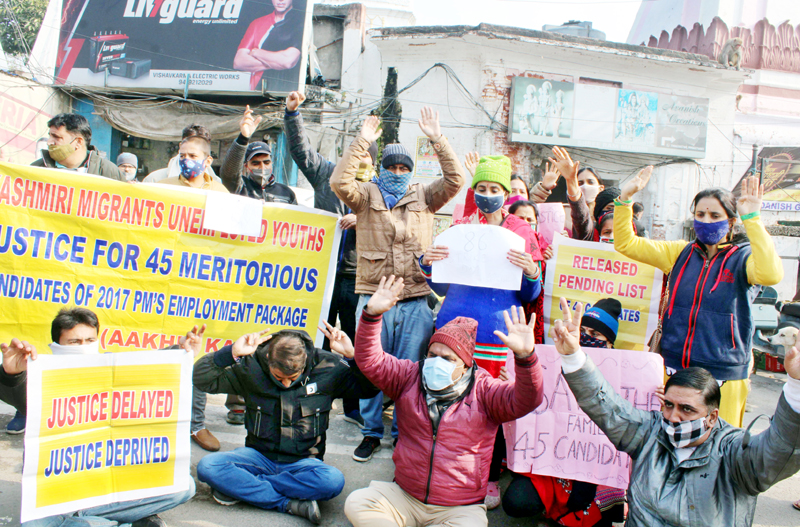 JAMMU, Dec 29: Despite qualifying the criteria for the appointment under PM package, the fourty five left out Kashmiri Pandit youth held protest outside Raj Bhavan here today.
