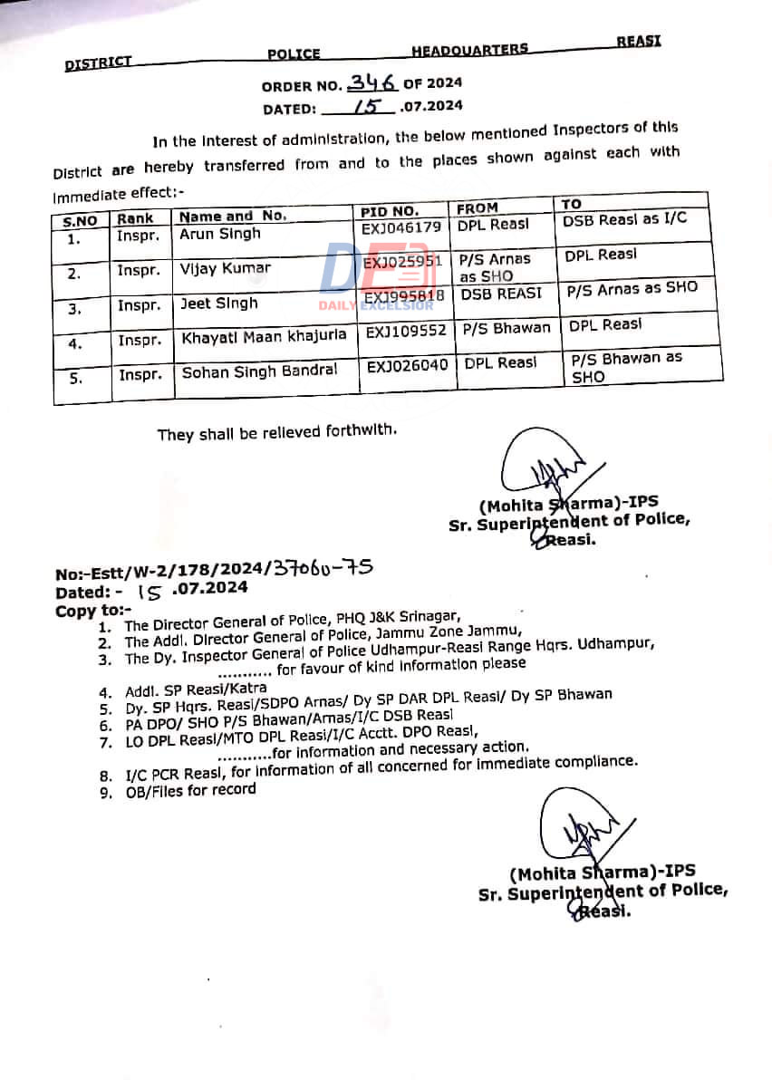 5 Inspectors Transferred In Reasi District By Daily Excelsior - July 15, 2024 Share FacebookTwitterWhatsAppPinterestLinkedinCopy URLTelegramEmailTumblrReddItPrintKoo JAMMU, July 15: SSP Reasi has ordered the transfer and posting of 5 Inspector ranked officers. Read the order issued in this context……. Follow our WhatsApp channel