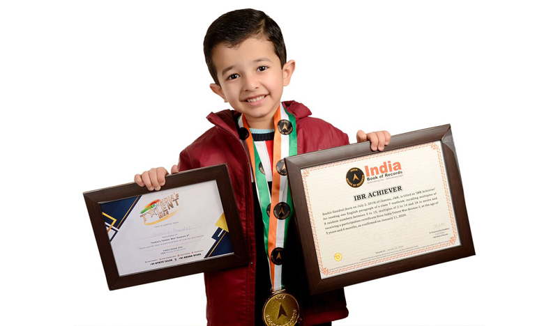 JAMMU, Mar 8: Saahir Gandral, a five-year-old little boy has been awarded the title of “IBR Achiever” by India Book of Records for his extraordinary ability in English and Mathematics.