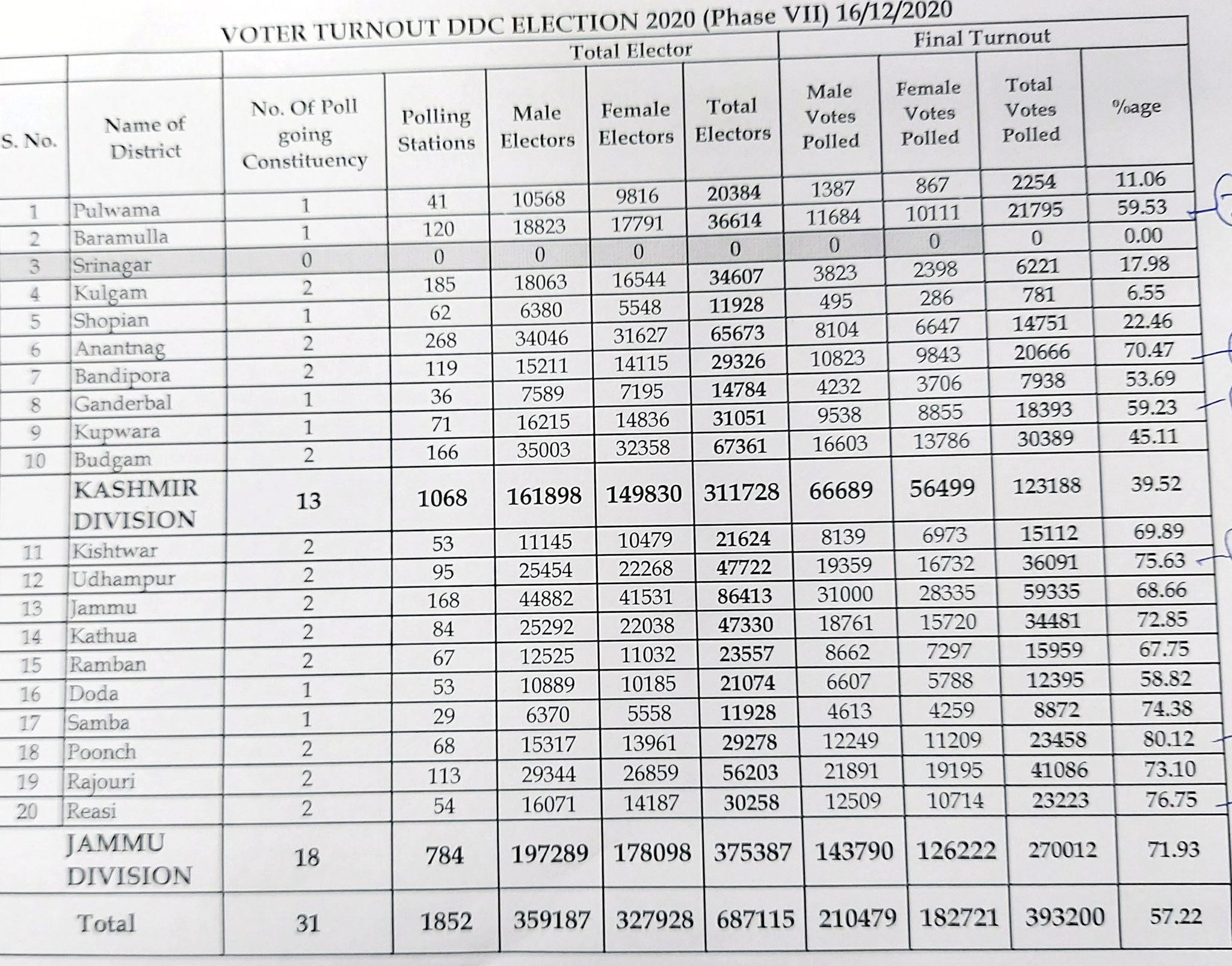 57.22 per cent voter turnout recorded in the seventh phase of District Development Council (DDC) elections across Jammu and Kashmir. By Daily Excelsior - December 16, 2020 Share FacebookTwitterWhatsAppPinterestLinkedinCopy URLTelegramEmailTumblrReddItPrintKoo 57.22 per cent voter turnout recorded in the seventh phase of District Development Council (DDC) elections across Jammu and Kashmir. Follow our WhatsApp channel