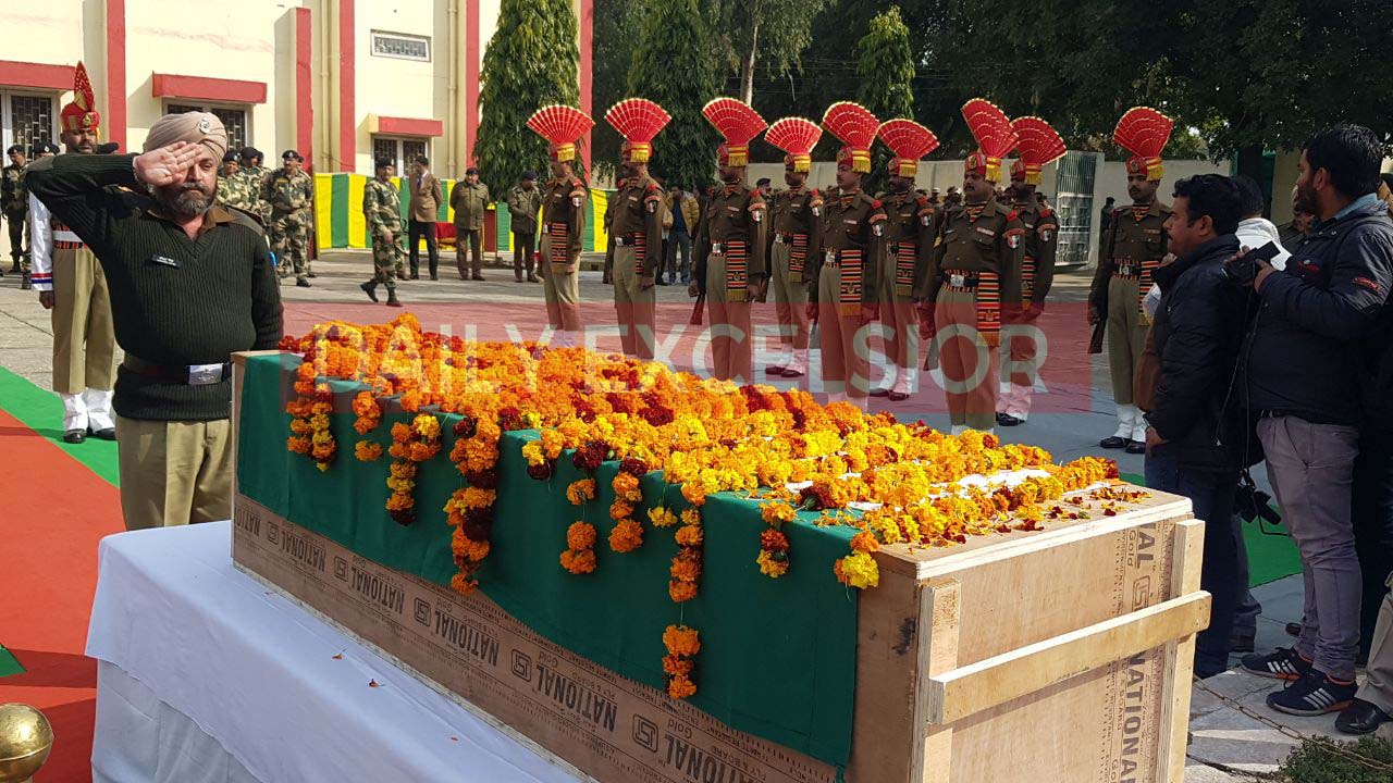 Wreath laying ceremony of BSF Head Constable A Suresh who lost his life in ceasefire violation by Pakistan in R S Pura sector – Excelsior/Rakesh By Daily Excelsior - January 18, 2018 Share FacebookTwitterWhatsAppPinterestLinkedinCopy URLTelegramEmailTumblrReddItPrintKoo Wreath laying ceremony of BSF Head Constable A Suresh who lost his life in ceasefire violation by Pakistan in R S Pura sector – Excelsior/Rakesh Follow our WhatsApp channel