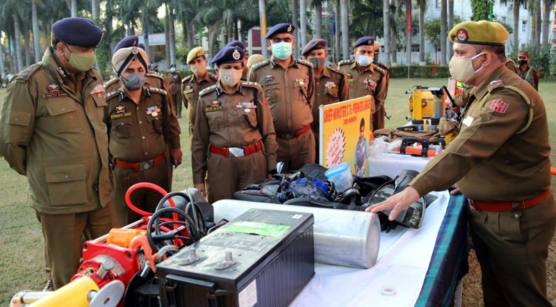 Danesh Rana, ADGP Commandant General HG/CD & SDRF J&K inspecting equipments during Raising Day celebrations.