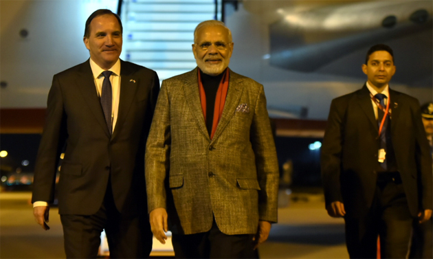 Swedish Prime Minister Stefan Lofven received Modi at the airport.