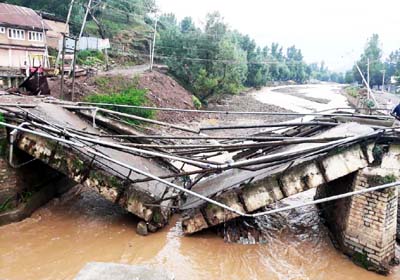 Srinagar, July 3: A portion of a bridge built over six decades ago in North Kashmir’s Kupwara district collapsed following heavy rains last night.