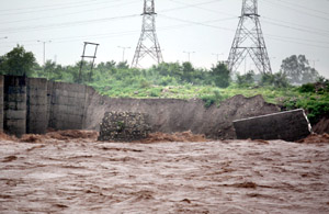 A strong embankment of Tawi artificial lake and two piers of flood gates, damaged in flood near 4th bridge in Jammu on Sunday. -Excelsior/Rakesh